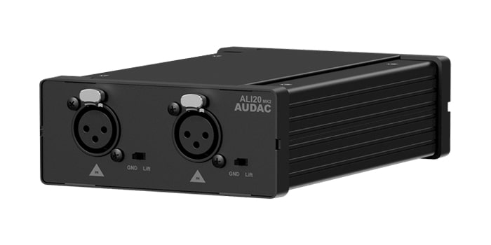 AUDAC ALI20MK2 - представляет собой стереофонический экранированный аудио изолятор, который по сути своей является трансформатором гальванической развязки и служит для предотвращения проникновения паразитных низкочастотных шумов 50 Гц из одного аудио устройства в другое. Его коэффициент трансформации составляет 1 : 1.