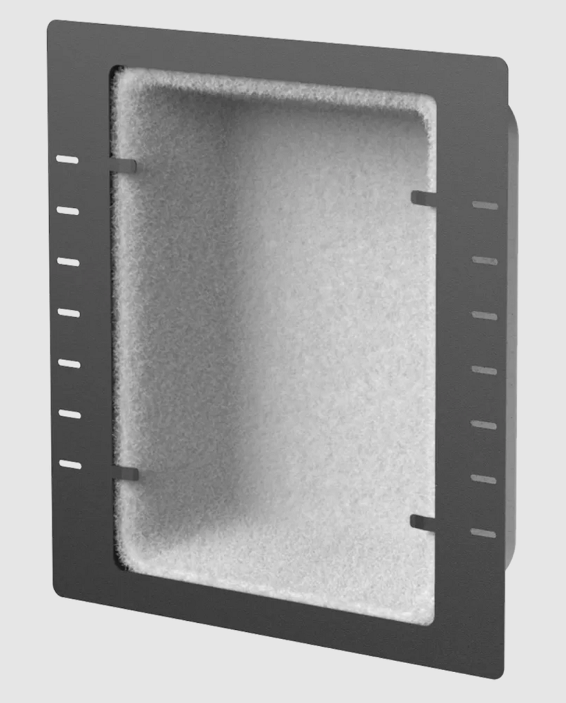 Огнестойкий стальной корпус с порошковым покрытием, цвет металлик. Габаритные размеры 446x455x127 мм, внутренний объем 15 литров. Бокс удобен для монтажа АС между различными настенными стойками или потолочными балками.