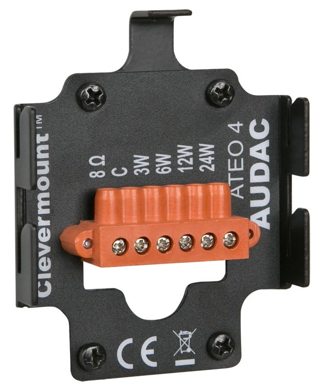 Clevermount крепление - это разработка инженеров AUDAC, благодаря которой акустическая система и монтажный кронштейн объединены в единую конструкцию. Для монтажа такой конструкции, на стене крепится ответная часть кронштейна к которой подключается кабель от усилителя. Далее, в специальные пазы ответной части устанавливается кронштейн и фиксируется страховочным винтом. С помощью такой конструкции, акустическую систему можно установить на стене как вертикально, так и горизонтально, давая возможность разворачивать ее в нужную сторону даже после того, как она смонтирована и подключена. Горизонтальная ориентация АС обеспечивает дополнительные преимущества при установке на потолке или высоко на стене, а возможность изменения ориентации корпуса позволяет создать равномерное звуковое покрытие в нужном угловом секторе.