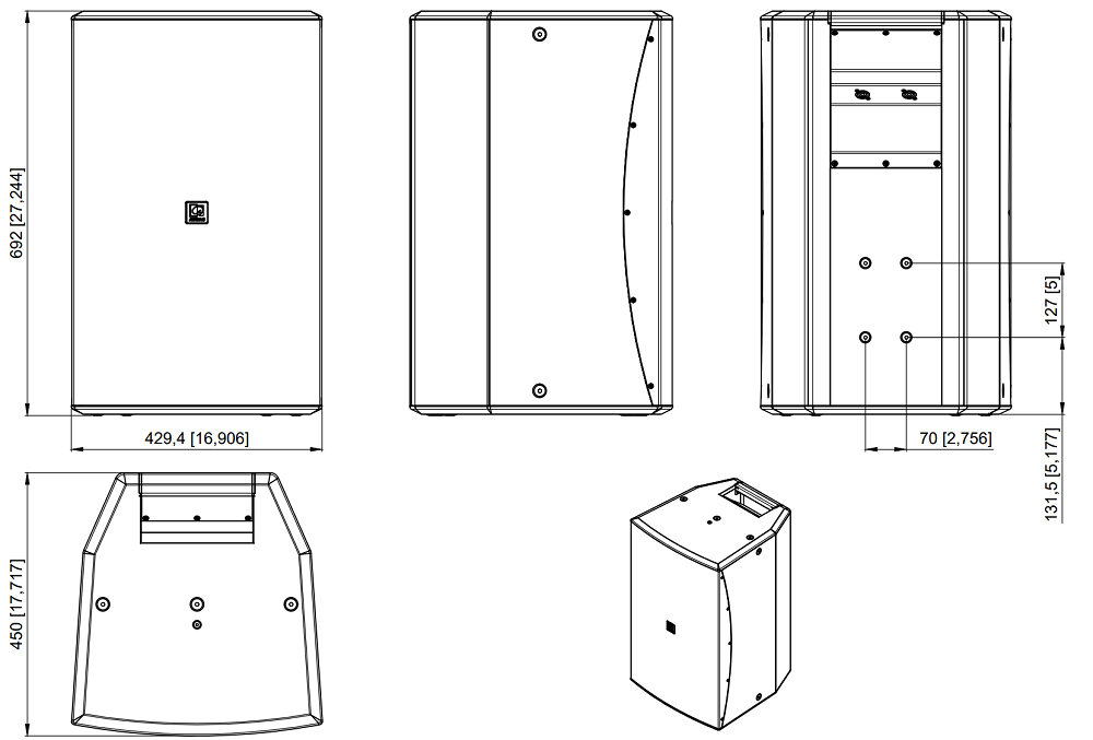 Оборудована двумя драйверами: 1” ВЧ твиттер и 12” НЧ вуфер, которые работают в широком диапазоне частот 50 Гц - 20 кГц и способны выдавать в обычном режиме работы звук высокой мощности 500 Вт (2000 Вт в пике) при подключении к низкоомному усилителю (8 Ом). Акустическую систему также можно применять в трансляционных линиях с напряжением 70/100В, если установить модуль трансформатора TRM124.