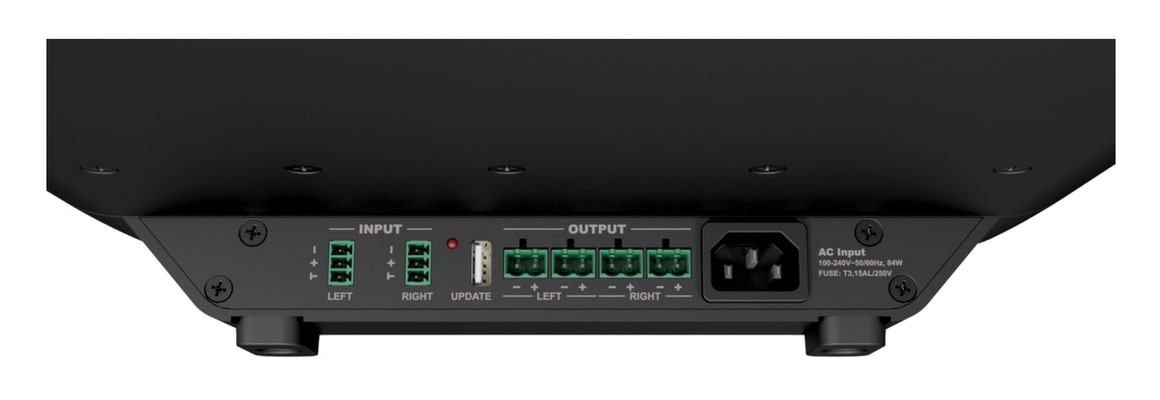 Данная модель сабвуфера оснащена высококачественным усилителем мощности класс D и компактным 8-дюймовым НЧ-вуфером с феритовым магнитом. Его номинальная выходная мощность составляет 100 Вт. Помимо этого, усилитель имеет дополнительные выходы для подключения двух пассивных акустических систем (сателлитов), мощностью по 150 Вт каждый. Вход аудиосигнала осуществляется при помощи двух балансных разъемов типа Euroblock, а акустические выходы - на четырех портах Euroblock. Дополнительно, в сабвуфере имеется цифровой порт USB, предназначенный для загрузки персональных пользовательских настроек с внешних USB-накопителей. Также, он может управляться дистанционно, посредством пульта ДУ (RMT40), который является опциональным и приобретается отдельно.