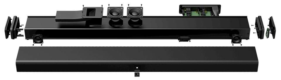 Данный саундбар оснащен двумя секциями драйверов - два высокочастотные 1.75″ и два низкочастотные 2.5″. Общая мощность составляет около 60 Вт (по 30 Вт на каждую секцию). За правильную работу отвечает встроенный усилитель D класса и процессор для обработки и передачи сигнала WaveSelect DSP, который обеспечивает кристально чистое воспроизведение звука с потрясающей низкочастотной характеристикой. Дополнительно, данный процессор имеет множество стандартных пресетов, благодаря которым можно добиться идеального качества звука в любой задаче.