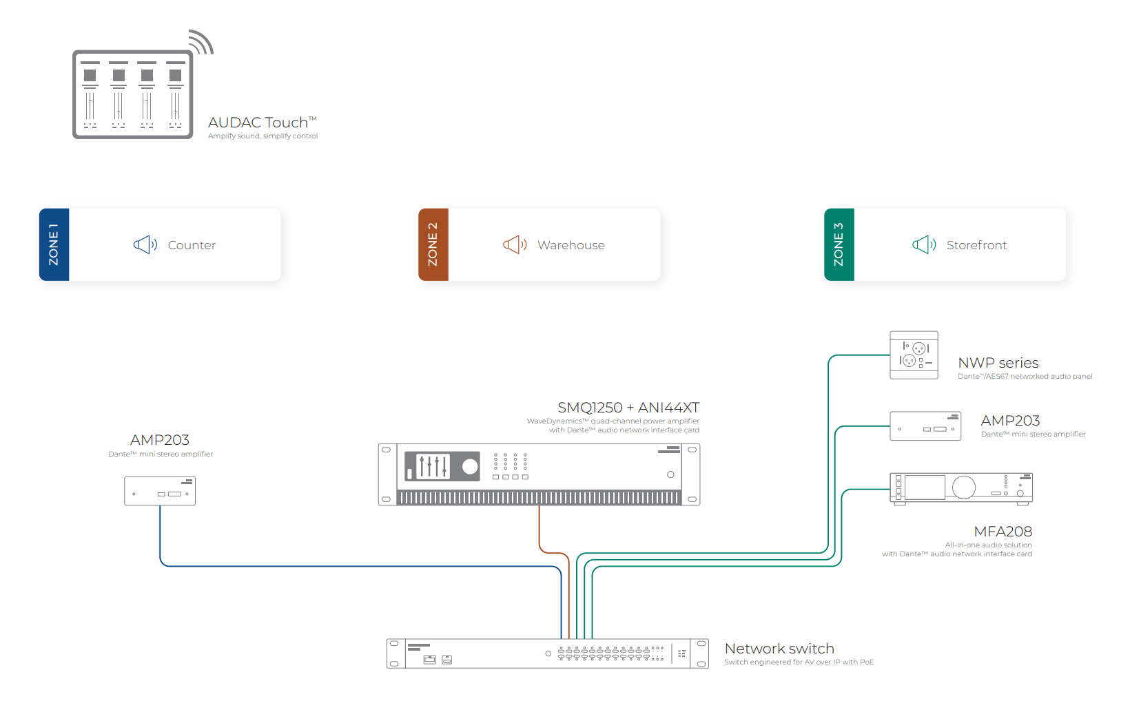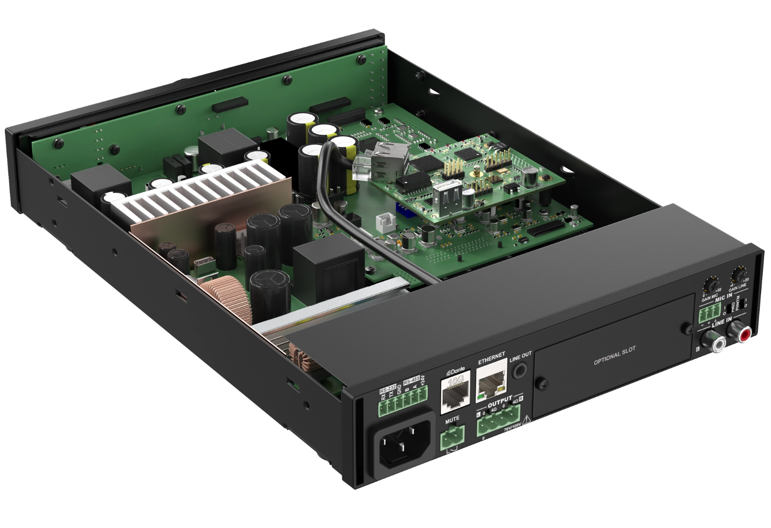 AUDAC ANI44XT – модуль сетевого интерфейса Dante с 4 входными и 4 выходными каналами для усилителей мощности MFA208, MFA216, SMQ1250, SMQ350, SMQ500, SMQ750, PMQ240, PMQ280, PMQ600. Устанавливается непосредственно в корпус усилителя и обеспечивает возможность его интеграции в любую AV сеть, поддерживающую Dante интерфейс. Это наиболее простое самоконфигурируемое решение с использованием конфигурации DHCP, которое может быть реализовано на базе существующей Ethernet-сети 100 / 1000 Base-T. Передача данных может осуществляться в дуплексном режиме по всем каналам одновременно с частотой дискретизации 48 кГц и битовой глубиной 24 бита. При этом задержка сигнала зависит от загруженности сети и не превышает 5 мс. Для удобства подключения и установки все необходимые элементы включены в комплект поставки.