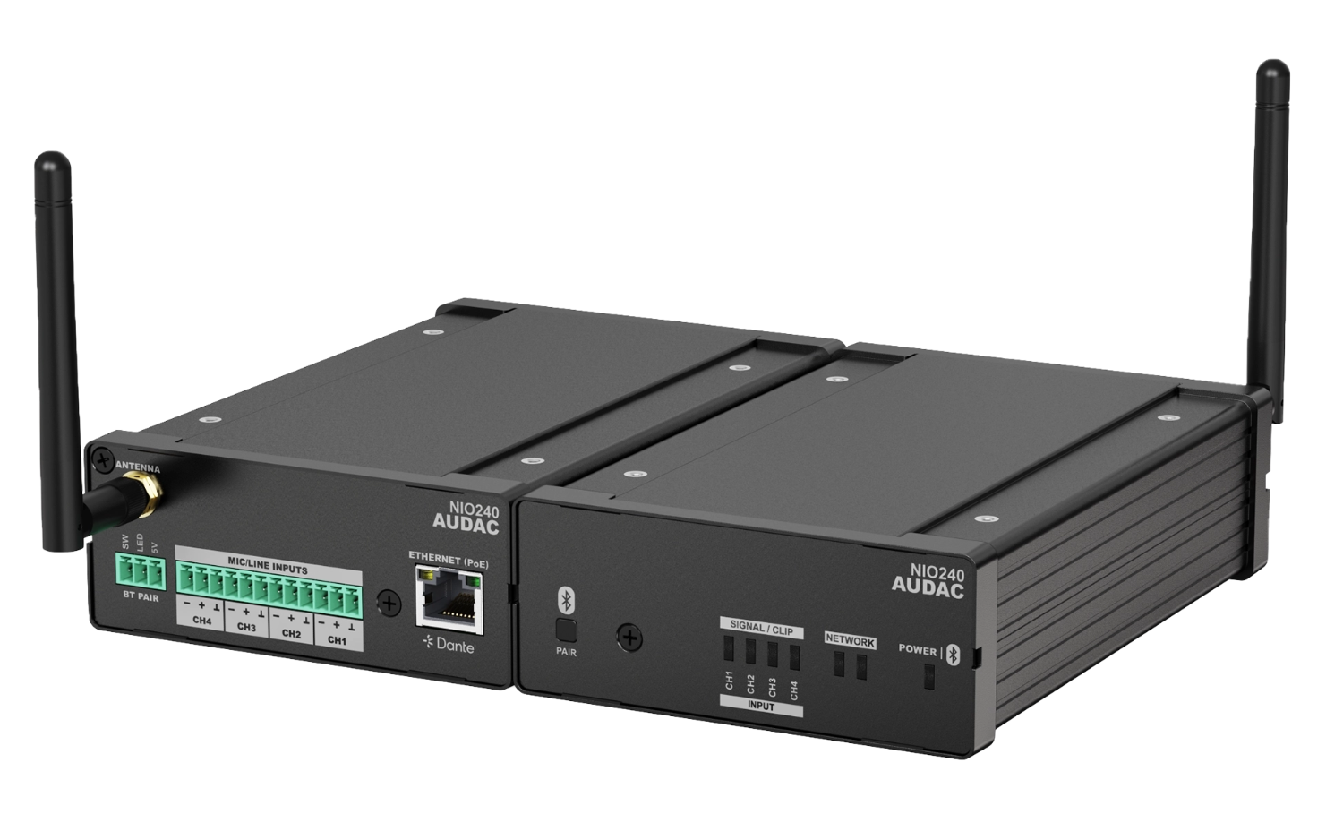 AUDAC NIO240 – сетевой модуль предназначенный для коммутации (микширования) сигналов с восьми различных (цифровых и аналоговых) аудиовходов на четыре цифровых аудиовыхода с обработкой звука встроенным цифровым аудиопроцессором (DSP).