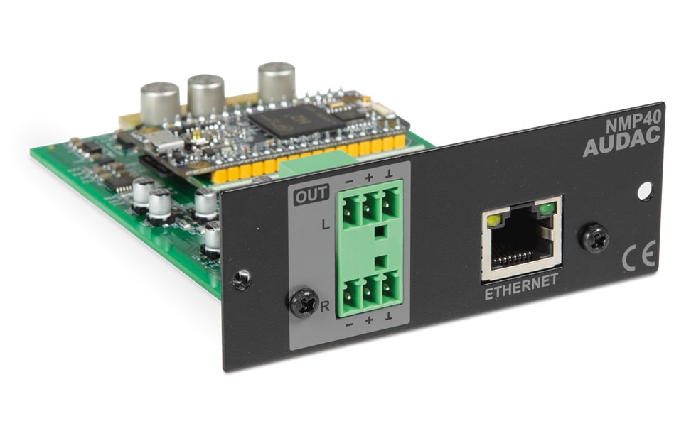 AUDAC NMP40 - это сетевой медиаплеер модульного типа для шасси AUDAC XMP44. Установка данного плеера (модуля) происходит по принципу Plug & Play, то есть модуль просто вставляется в свободный слот шасси и фиксируется двумя винтами, вся дальнейшая настройка происходит автоматически, после чего все готово к работе. Данный плеер поддерживает воспроизведение потокового аудио через популярные сервисы, такие как Spotify Connect и Soundtrack Your Brand, при этом в качестве контроллера управления может выступать Ваш компьютер, планшет либо смартфон. Поддерживается самое высокое качество аудиофайлов, при этом нету задержек и прерывания сигнала.