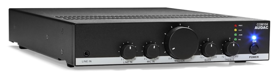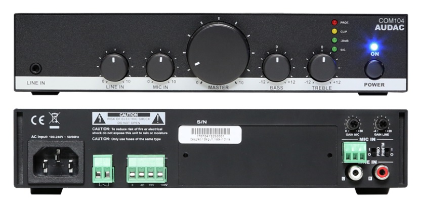 AUDAC CANTO5.4 – бюджетный звуковой комплект с максимальной выходной мощностью 40 Вт, предназначенный для организации качественного фонового озвучивания и оповещения небольших магазинов, бутиков, кафе, баров, кофеен, и других объектов площадью до 100 м². Он позволяет транслировать аудио файлы с внешнего источника линейных сигналов и передавать сообщения с микрофона, в том числе требующего подачи фантомного питания. Также доступна автоматическая трансляции аварийных сообщений по управляющему сигналу от системы ОПС. Вывод сигнала на акустические системы выполняется через 70/100 В выходы УМ.