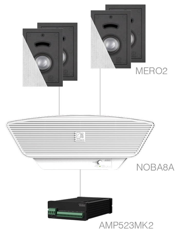 Звуковой комплект для помещений площадью до 100 м²; состоит из активного сабвуфера NOBA8A, усилителя AMP523MK2 и 8 настенных акустических системы MERO2; выходная мощность 180 Вт (в режиме 16 Ом); доступен с акустикой в черном или белом цвете на выбор.