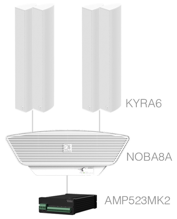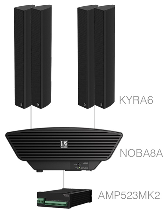 Функцию звукоусиления в этом комплекте выполняет активный сабвуфер с встроенным усилителем класса D. Усилитель мощности же используется для расширения функциональных возможностей системы – наращивания количества доступных подключений внешних источников сигналов и реализации удаленного управления по прот. RS-232 и RS-485 (с поддержкой аудио) через web-браузер или мобильное приложение AUDAC Touch. Также УМ позволяет наращивать мощность системы путем подключения дополнительной акустики к 2 выходным каналам или же вывода сигнала на внешний усилитель.