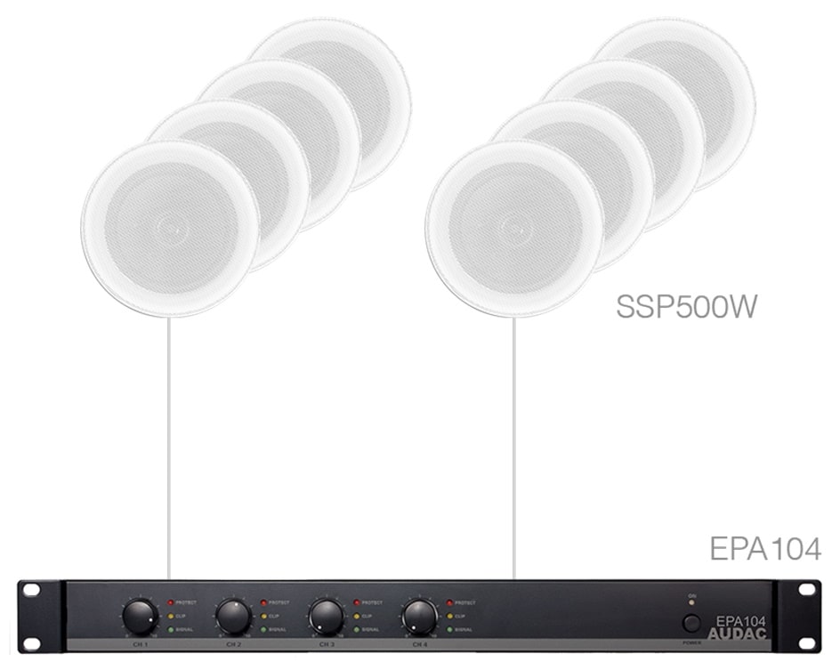 AUDAC PURRA4.8E – это звуковой комплект мощностью в 160 Вт, который подойдет для озвучивания средних по площади помещений до 200 м2. Данный комплект состоит из четырехканального усилителя мощности AUDAC EPA104 и восьми встраиваемых акустических систем AUDAC SSP500. Благодаря тому, что используемые акустические системы имеют высокую степень влагозащиты и устойчивы к воздействию высоких температур, данный комплект идеально подойдет для озвучивания бань, саун, залов с бассейнами, SPA, душевых кабин или открытых площадок. Высокая функциональность используемого усилителя мощности позволяет подключать внешние источники звука (плееры, компьютеры и т.п.), внешние микрофоны, выносные панели управления и регуляторы громкости, что делает данный комплект универсальным в применении, высокофункциональным и достаточно надежным. Также имеется запас мощности, что позволяет расширить систему до 400 Вт (4 канала по 100 Вт при подключении 4 Ом акустических систем). После установки все оборудование сразу готово к работе, что позволит организовать озвучивания любого помещения без привлечения специалистов.