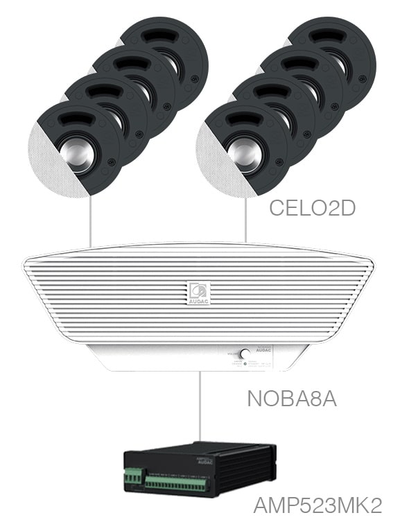Звуковой комплект для помещений площадью до 50 м²; состоит из активного сабвуфера NOBA8A, усилителя AMP523MK2 и 2 потолочных акустических системы CELO2; выходная мощность 120 Вт (в режиме 8 Ом); доступен с акустикой в черном или белом цвете на выбор.