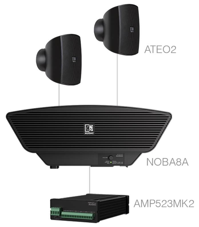 AUDAC SONA2.3+ – современный звуковой комплект с выходной мощностью 120 Вт, высоким качеством звучания, удобным управлением и отличным внешним видом акустики. Он состоит из активного сабвуфера NOBA8A с встроенным цифровым УМ, выполняющего функцию звукоусиления, 2 настенных акустических системы ATEO2 для вывода сигнала и портативного сетевого усилителя мощности AMP523MK2, предназначенного для наращивания количества доступных подключений внешних источников сигналов и реализации удаленного управления по прот. RS-232 и RS-485 (с поддержкой аудио) через web-браузер или мобильное приложение AUDAC Touch. Комплект отлично подойдет для озвучивания магазинов и бутиков, кафе и ресторанов, гостиниц и отелей, салонов красоты, офисов, учебных заведений и других объектов площадью до 25 м².