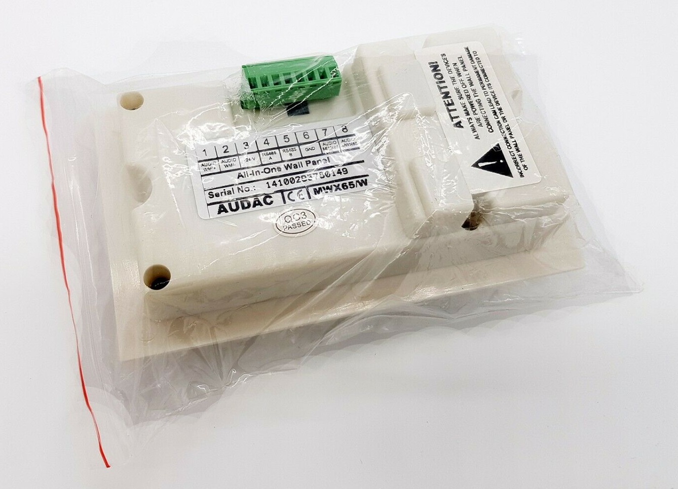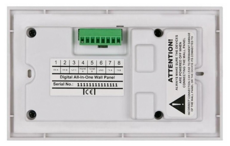 Панель изготовлена в малогабаритном корпусе из ABS пластика и предполагает монтаж врезным или накладным способом с применением соответствующих установочных изделий. Подключение к основному оборудованию (MTX48/MTX88) выполняется кабелем UTP CAT5 и выше через порт RS-485 (8-pin Euro Terminal Block). При этом общая длина соединительной линии не должна превышать 500 м. Белый цвет корпуса (RAL9010).