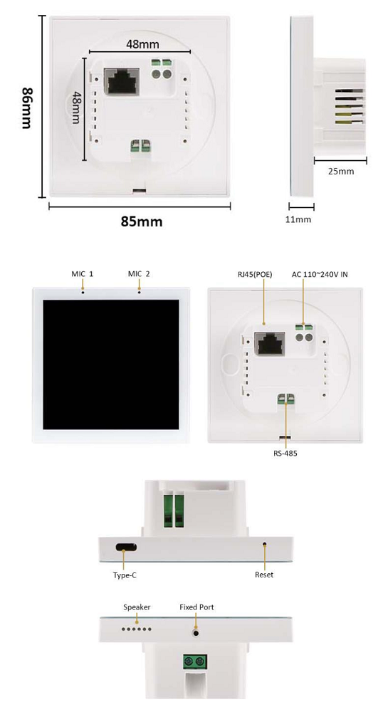 Современный стильный корпус выполнен из ABS-пластика и подходит под любые интерьеры. Внешние габаритные размеры 89*89*36 мм, вес 144 г. Белый цвет. Два варианта питания по технологии PoE (IEEE802.3af) или сетевое AC 220В, через адаптер. Панель встраивается в стену, размеры монтажного отверстия 48*48*25 мм.