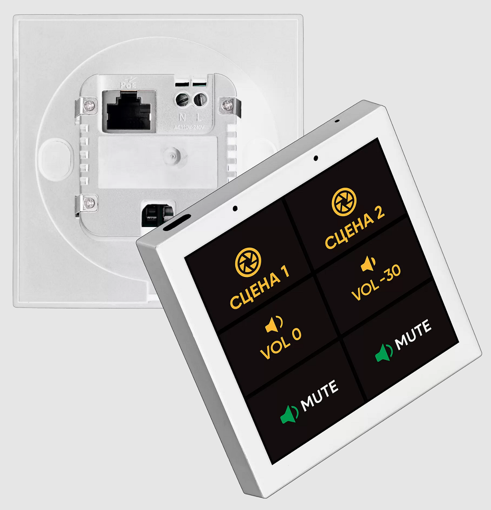Панель оснащена сенсорным IPS-дисплеем с диагональю 4 дюйма, разрешением 480*480 px и светимостью 300 нит (регулируется). Назначение кнопок настраивается. Работает под управлением надежной и проверенной множеством юзеров операционной системы Android 13 с оболочкой Audac Touch2. Техническое наполнение: процессор RK3566, Cortex-A55 на 4 ядра, тактовая частота 1.8 ГГц; оперативная память 2 Гб, встроенная постоянная память 32 Гб. Предусмотрены следующие разъемы 1х RJ-45 (управление через TCP/IP и питание PoE), 1х RS-485 и 1х USB Type-C, 1х Phoenix 2-pin (питание от сети 220В). Беспроводное подключение гаджетов через встроенные модули Wi-Fi (802.11b/g/n) и Bluetooth 5.2.