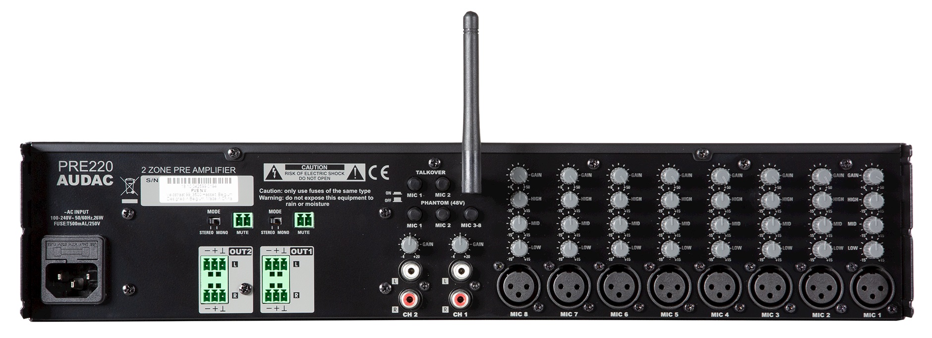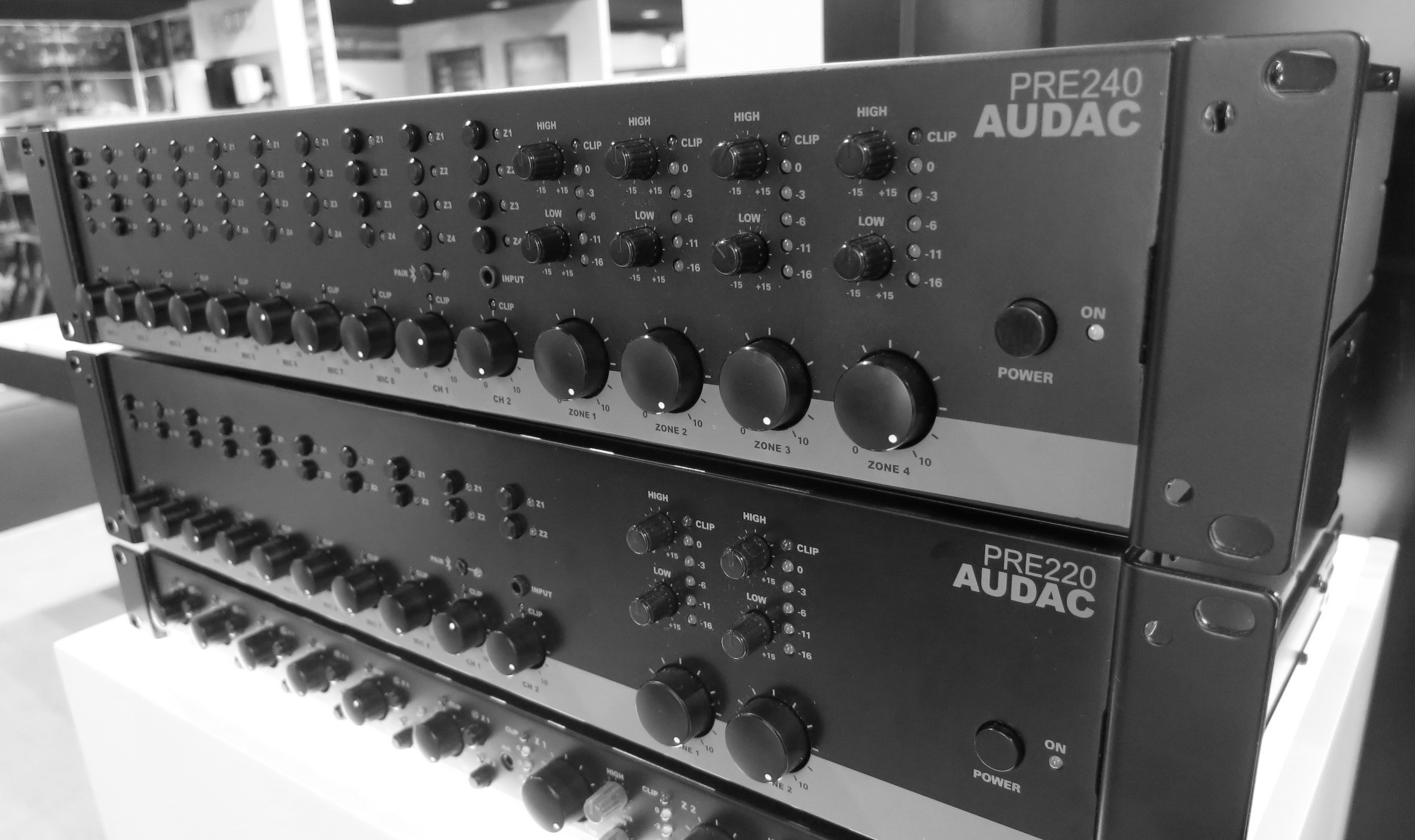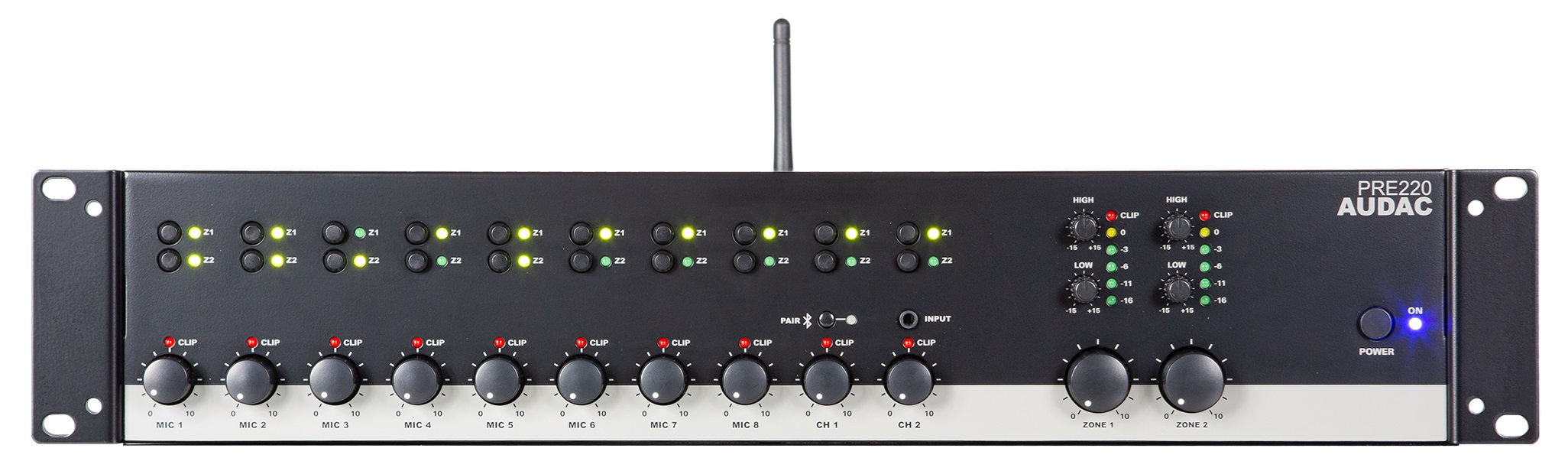 PRE220 – 10-канальный микшер-предусилитель на 2 зоны от компании AUDAC, который представляет собой достаточно простое, но при этом многофункциональное решение для систем озвучивания объектов средних и крупных габаритов. Его конструкция с 10 входами предполагает возможность подключения аудио источников любого типа (Mic, Line, Bluetooth), сигналы с которых обрабатываются, микшируются и передаются на 2 Line выхода. Также предусмотрена возможность активации приоритета на Mic входах с приглушением прочих источников или полного отключения звука по сигналу от внешних систем (контакты MUTE), что может использоваться для передачи служебных объявлений или тревожных сообщений СОУЭ. Для удобного мониторинга и управления все необходимые индикаторы, регуляторы и кнопки вынесены на фронтальную панель. Тут же предусмотрен Line стерео вход на miniJack 3.5 мм и кнопка активации Bluetooth, позволяющие подключать портативные устройства – ноутбуки, планшеты, смартфоны и т.д. Выпускается в компактном RACK корпусе высотой 1U и предполагает питание от сети AC 100-240 В.