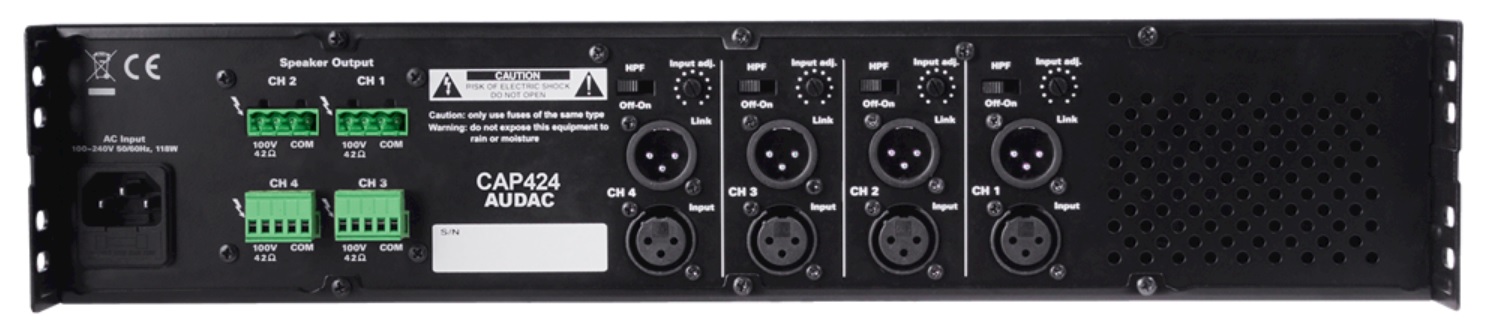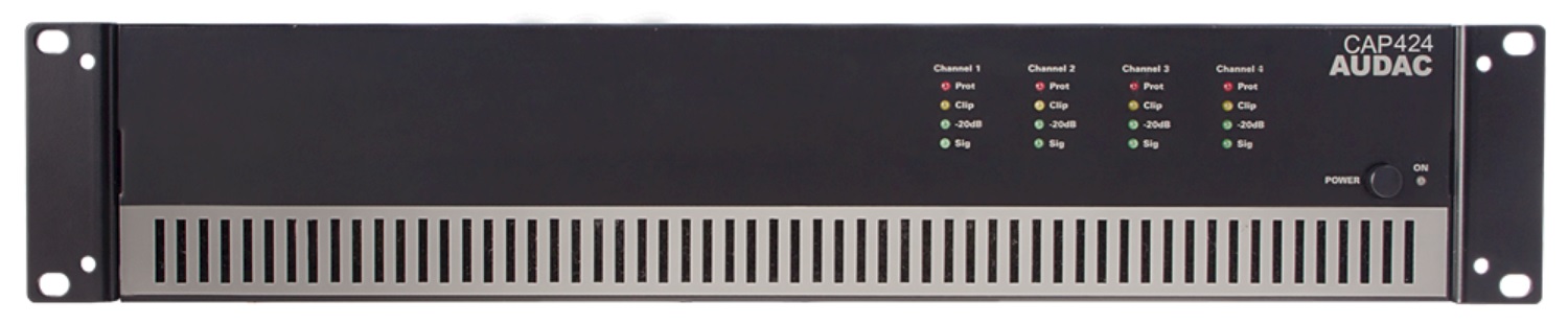 CAP424 – четырехканальный усилитель мощности класса D от компании AUDAC, удовлетворяющий потребности большинства стандартных систем оповещения и озвучивания. Его выходной мощности 4х240 Вт вполне достаточно для озвучивания объектов средних и крупных габаритов, а широкий диапазон частот 50 Гц - 22 кГц позволяет обеспечить весьма достойное качество звучания при использовании качественной акустики. Еще одно важное достоинство данного устройства это возможность деления объекта на 4 зоны объекта с целью трансляции в них информации с различных источников, что особенно актуально при построении СОУЭ да и просто систем озвучивания в зданиях с помещениями различного назначения.