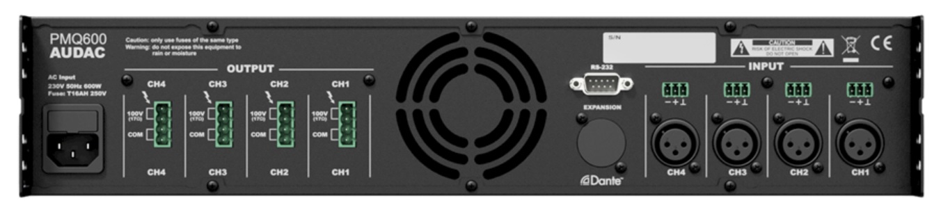 Задняя панель снабжена аудиовходами на разъемах XLRf и Euroblock 3-pin, клеммниками Euroblock 4-pin для подключения 100 В линий АС и портом RS-232 для внешнего удаленного управления. Дополнительно предусмотрена возможность установки опционального сетевого интерфейса Dante™, позволяющего выполнять прием/передачу звукового сигнала высокого качества и с минимальной задержкой по стандартной сети Ethernet.