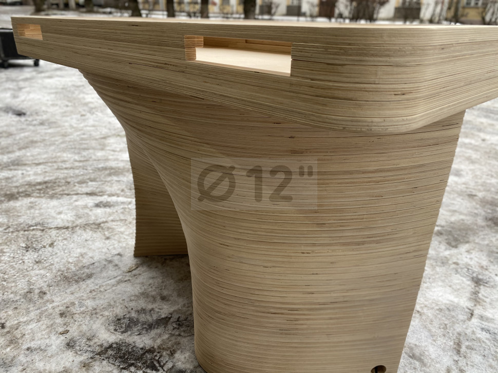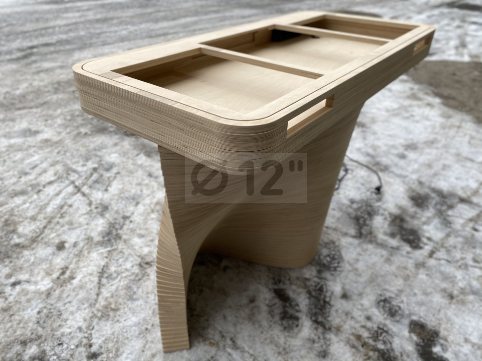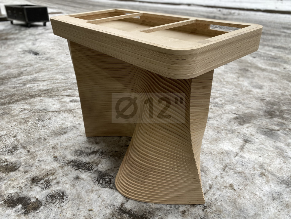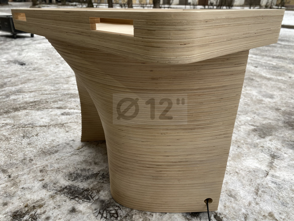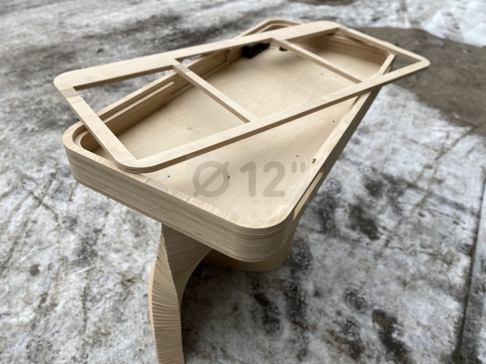 Материал фанера толщиной 18 мм, покрыта бесцветным лаком. Габаритные размеры 1200*650*900 мм, вес 70 кг. Оригинальный современный дизайн, отечественное производство, высокая прочность конструкции.