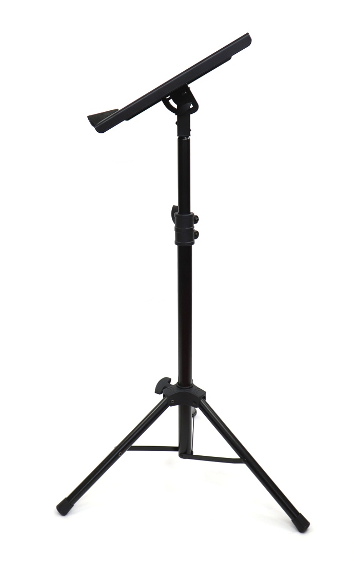 Площадка (платформа) для ноута имеет размеры 28 x 40 см и может быть наклонена на угол до 90°. Высота стойки регулируется в пределах от 75 см до 120 см. Материал сталь.