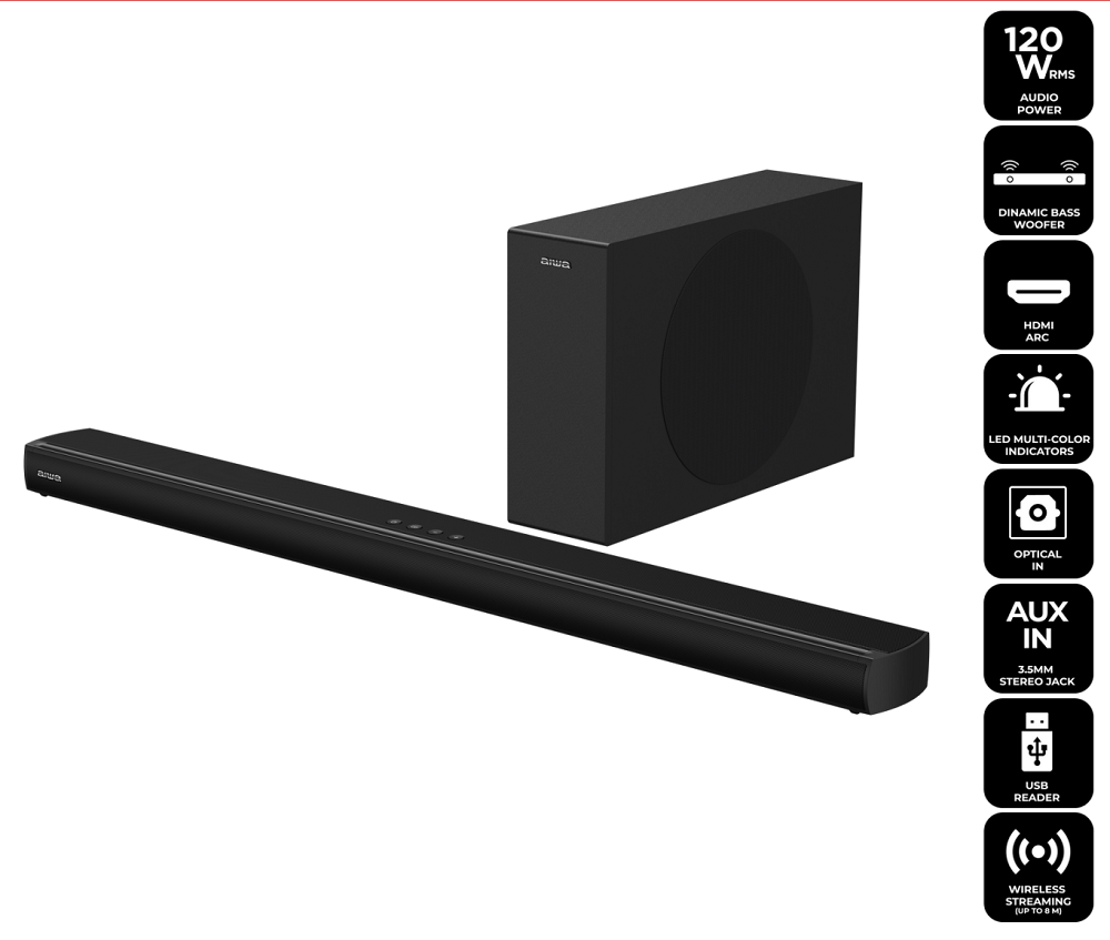 AIWA HE-1200SW — это комплект высококлассной домашней аудиосистемы, в который входят ультратонкий саундбар и беспроводной сабвуфер. Два прибора способны заменить гораздо большее количество колонок без малейшей потери качества. Это прекрасное решение, когда необходима полноценная музыкальная система для самостоятельной работы или в паре с современным телевизором, с небольшим количеством устройств и практически без коммутационных элементов. В каждый прибор встроен высокоэффективный цифровой усилитель мощности c низким уровнем искажений и среднеквадратичной (RMS) мощностью на выходе 60 Вт при THD 10%. Общая мощность всей системы составляет 120 Вт.