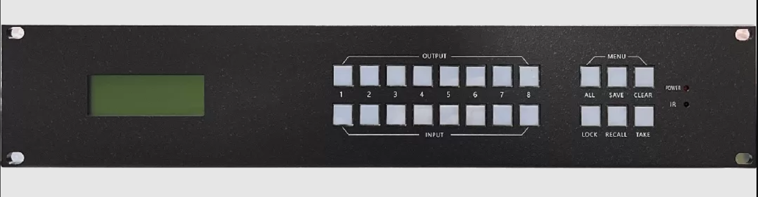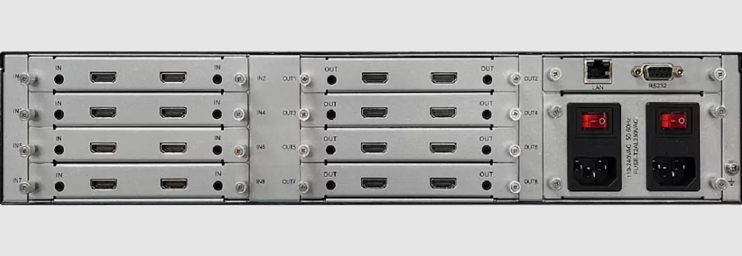 Всего предусмотрено 8 слотов для плат: четыре (4) входных и четыре (4) выходных. Каждый слот оборудован двумя контактами цифрового стандарта HDMI: входные и выходные (8 х 8 каналов); звук выводится через аналоговый разъём Jack 3.5 мм. Встроенное меню позволяет производить независимо на каждом из выходов следующие настройки видеосигнала: контрастность, яркость, чёткость, уровень насыщенности цвета и глубину цветовой компенсации. Управление работой устройства и все настройки либо вручную через дисплей и элементы управления на лицевой панели корпуса, либо дистанционно, для чего прибор подключается по сетевым коннекторам 1х RS-232 и 1x RJ-45.