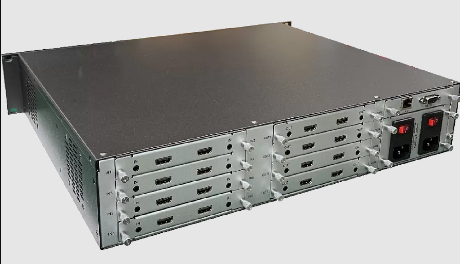Шасси матричного коммутатора AVCLINK MC-0808 - это модульное устройство для объединения в одном корпусе нескольких сетевых аудио-видео карт (печатные платы) для коммутации сигналов форматов HDMI, DVI, HDBaseT, SDI. Скорость передачи данных зависит от разрешения видеосигнала, максимум 18 Гбит/сек.
