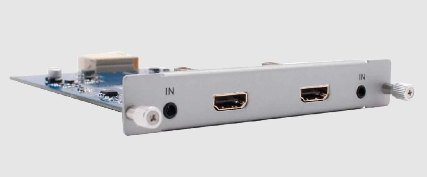 AVCLINK MC-HD-2IN - представляет собой плату расширения для шасси модульного коммутатора AVCLINK серии MC (MC-0808, MC-1616, MC-3636, MC-8080). Модуль рассчитан на работу с высококлассными цифровыми видеосигналами формата HDMI и оснащён двумя (2) соответствующими входами. Также предусмотрены два (2) аналоговых аудиовхода на разъёмах стерео mini-Jack 3,5 мм. Возможно выбирать аудиосигнал между цифровым эмбедированным и аналоговым.