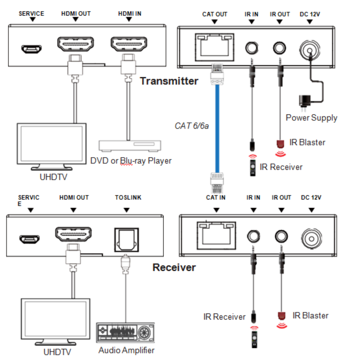 На вход блока передатчика (1x HDMI) поступает указанный сигнал, преобразуется в сетевой формат Ethernet и через сетевой выход RJ-45 отправляются по кабелю CAT 5E/6 на аналогичный сетевой вход приёмника. Далее преобразуется в сигнал начального формата и поступает на выход приёмника 1x HDMI, к которому подключается внешнее оборудование. Предусмотрена двусторонняя передача управляющего ИК-сигнала, а также отдельный съём звука с приёмника (стерео 1х 3,5 mini-Jack) и служебный разъём 1х mini-USB у приемника и передатчика, который используется для обновления. Дополнительно передатчик оснащён выходом HDMI, который применяется с целью сквозного подключения ещё одного (контрольного) средства отображения (экрана), а у приемника есть выход TOSLINK. Максимальное разрешение видеосигнала 4k@60Hz.