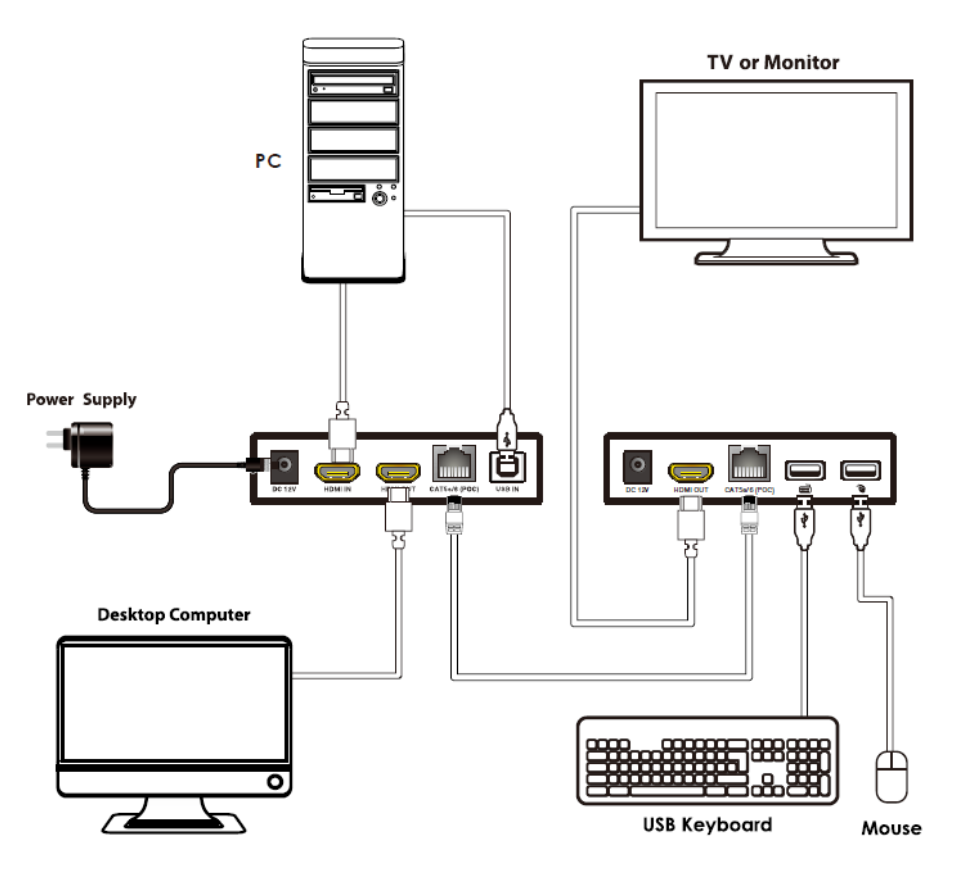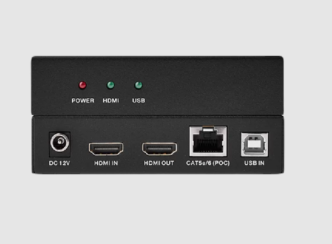 На входы блока передатчика (1x HDMI и 1x USB-B) поступают указанные сигналы, преобразуются в сетевой формат Ethernet и через сетевой выход RJ-45 отправляются по кабелю CAT 5E/6 на аналогичный сетевой вход приёмника. Далее преобразуются в сигналы начального формата и поступают на выходы приёмника 2x USB-A, 1x HDMI, к которым подключается внешнее оборудование. Дополнительно передатчик оснащён выходом HDMI, который используется с целью сквозного подключения ещё одного (контрольного) средства отображения (экрана). Максимальное разрешение видеосигнала 1920x1080@60 Гц.