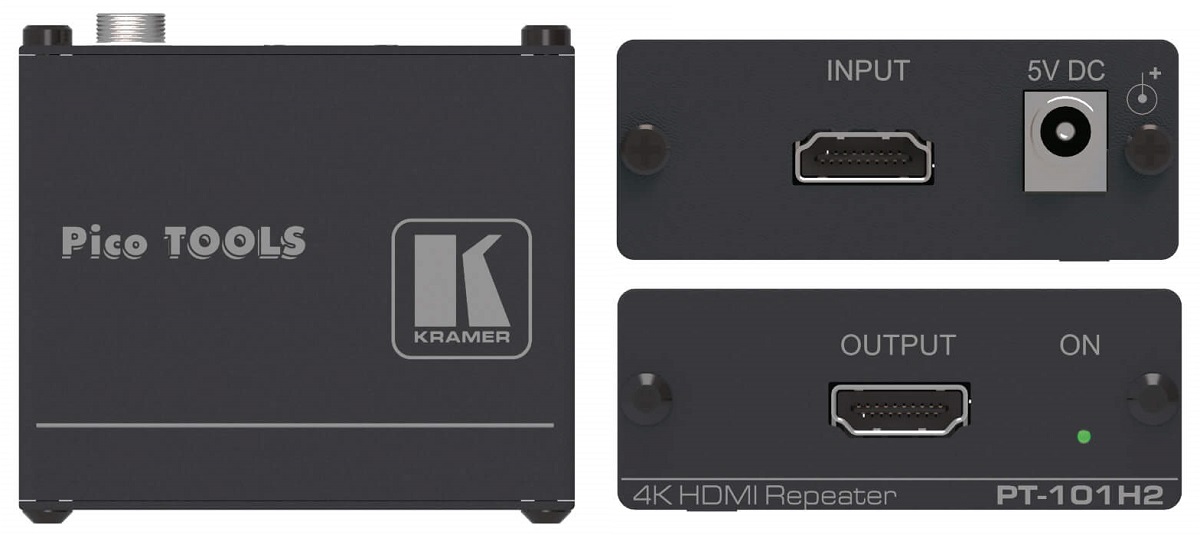 KRAMER PT-101H2 – высокопроизводительный HDMI репитер, позволяющий увеличить расстояние между источником сигнала и дисплеем до 10 или 20 м при разрешении сигналов 4K@60 Гц или 4K@30 Гц соответственно. Выпускается устройство в корпусе малых габаритов Pico TOOLS™, питание получает через блок питания 5 В DC (в комплекте) от внешнего источника.