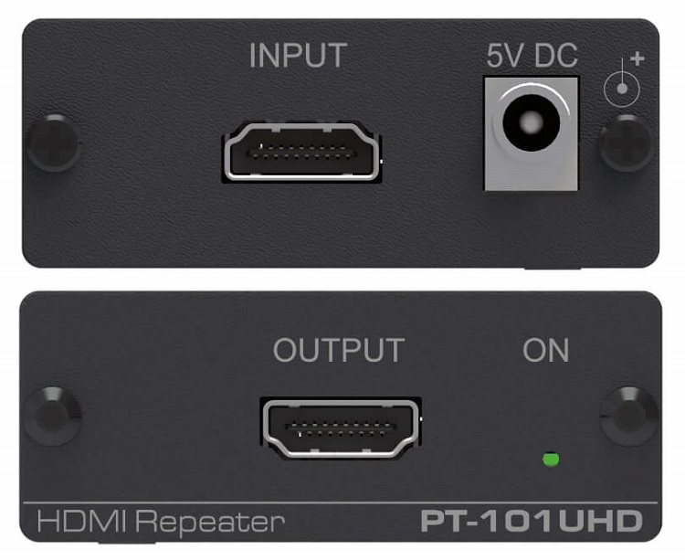 KRAMER PT-101UHD – высокопроизводительный HDMI репитер, позволяющий увеличить расстояние между источником сигнала и дисплеем до 10 или 20 м при разрешении сигналов 4K@60 Гц или 4K@30 Гц соответственно. При этом скорость передачи информации составит 17,82 Гбит/с. Выпускается устройство в корпусе малых габаритов Pico TOOLS™, питание получает через блок питания 5 В DC (в комплекте) от внешнего источника.