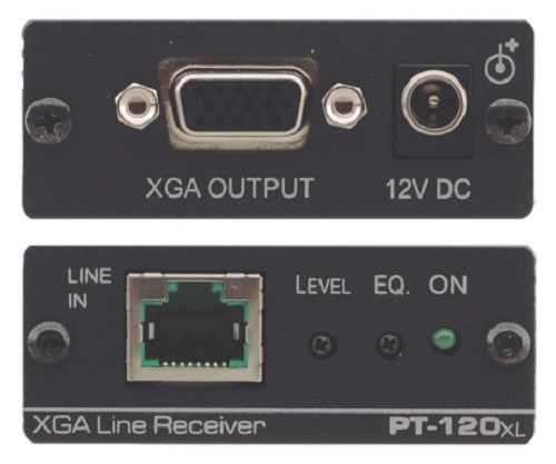 Приемник Kramer PT-120XL применяется для приема сигнала, передаваемого по витой паре передатчиком Kramer PT-110XL, и его дальнейшего преобразования в сигнал компьютерной графики VGA или телевизионный сигнал. При этом рекомендованная протяженность кабельной трассы между приемником и передатчиком должна составлять не более 250 метров, однако в зависимости от примененных кабелей и разрешения изображения она может быть увеличена. Прибор оснащен одним входом RJ45 для подключения витой пары и выходом VGA-UXGA на разъеме HD-15F, а также регуляторами уровня сигнала и АЧХ. Выпускается в корпусе малых габаритов Pico TOOLS™, питание получает от внешнего источника через блок питания 12 В DC (в комплекте) или по линии витой пары от передатчика Kramer TP-110XL (функция Power Connect™).