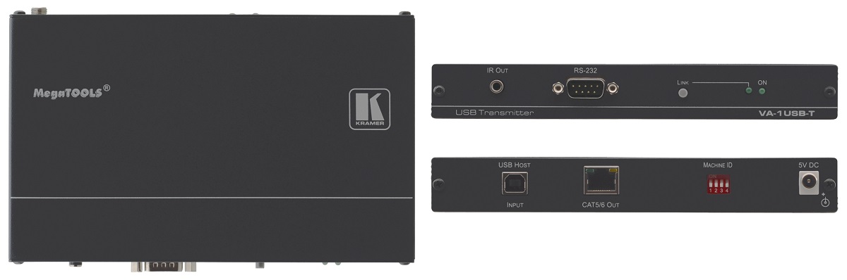 VA-1USB-T – высокопроизводительный передатчик сигналов USB, RS-232 и ИК по сети Ethernet, реализованной с применением кабелей витая пара категории 5 (CAT 5) и выше. Устройство выполняет преобразование принятых сигналов и их дальнейшую передачу на совместимый приемник VA-1USB-R. При этом скорость передачи информации составляет 100/1000 Мбит/с, а максимальная длина кабельной трассы между оборудованием может достигать 100 м. Передатчик выпускается в компактном настольном корпусе Kramer Mega TOOLS™, питание получает от внешнего источника через блок питания 5 В DC.