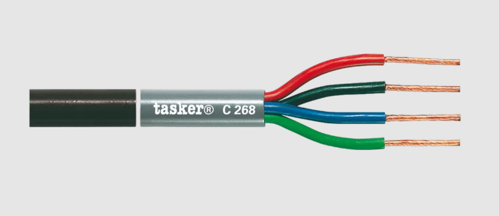 TASKER C268-BLACK - это круглый профессиональный аудиокабель (квадро), который используется для подключения аналоговой пассивной акустики различного назначения, в том числе Hi-Fi класса по схеме bi-wiring. Адаптирован под применение с разъёмами типа Speakon.