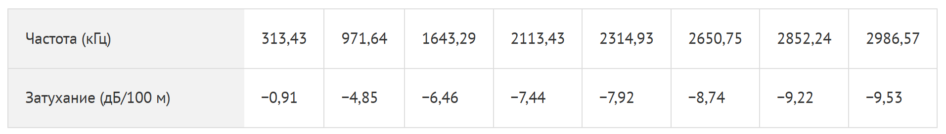 Погонное сопротивление = 3.1 Ом/км, емкость жила/жила 126.6 пФ/м (1 кГц), индуктивность проводника 0.44 мкГн/м. Рабочие температуры от -20° до +75°С, допускается прокладка на улице.