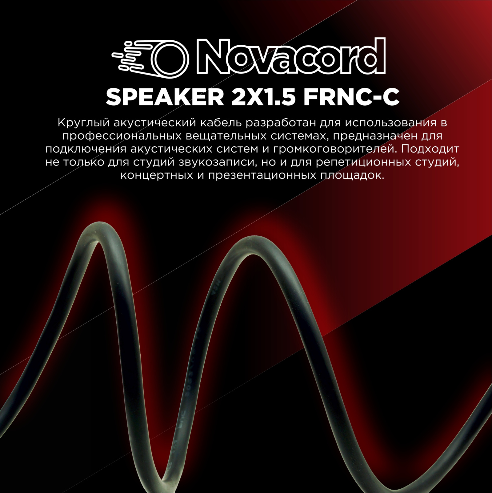 NOVACORD Speaker 2x1,5 FRNC-C - высококачественный акустический кабель с двумя (2) медными проводниками (OFC, бескислородная медь). Имеет круглое сечение 2 x 1,5 мм², диаметр 6,2 мм, AWG 16. Сопротивление менее 11,6 Ом на 1 км. Предназначен для распайки акустических (спикерных) разъёмов с целью подключения аудиоустройств. Используется в студиях, репетиционных, концертных и презентационных залах и т.д.