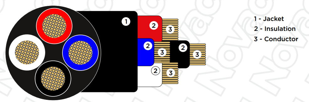 Изоляция проводников выполнена из LSZH-FR (бездымный негорючий материал) красного, черного цвета, белого и синего цвета, а гибкая оболочка из FRNC-C (пожароустойчивый, не подверженный коррозии материал) черного цвета. Встроенный кевларовый филлер. Не распространяет горение, соответствует требования пожарной безопасности IEC 60332-3-24. Поставляется в бухте.