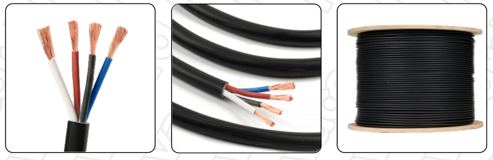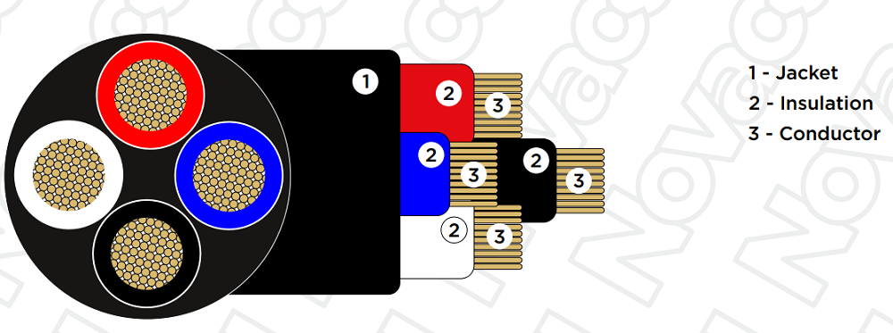 Изоляция проводников выполнена из PVC (поливинилхлорид) красного, черного, белого и синего цветов, а гибкая оболочка из PVC черного цвета. Не распространяет горение, соответствует требования пожарной безопасности IEC 60332-1. Поставляется в бухте: общий вес 88 кг, размотка 300 м.