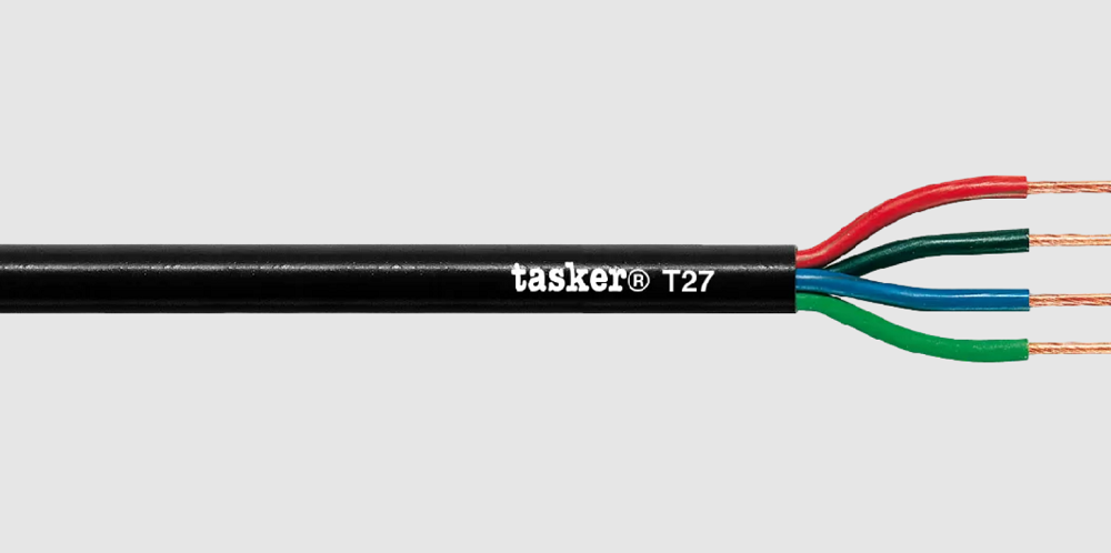 TASKER T27 - это круглый профессиональный аудиокабель (квадро), который используется для подключения аналоговой пассивной акустики различного назначения, в том числе Hi-Fi класса по схеме bi-wiring. Адаптирован под применение с разъёмами типа Speakon.