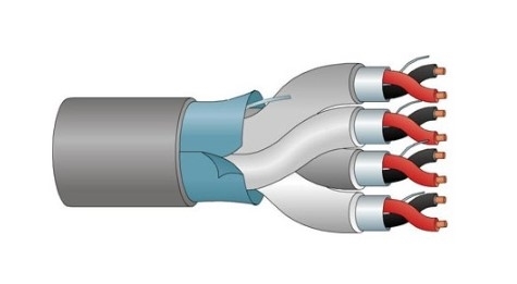 Каналы, как и сами проводники, свиты друг с другом, объединены полиэстеровой лентой, проложены для увеличения прочности хлопковыми кордами и помещены в общий экран из алюминиевой фольги с дренажной жилой из луженой меди. Внешняя оболочка, общая для всех четырех каналов, из гибкого ПВХ, диаметр кабеля 11 мм. Серый цвет. Рабочие температуры от -20° до +75°С.