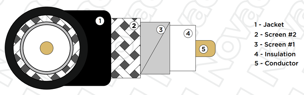Состоит из одного (1) медного проводника (OFC, бескислородная медь) диаметром 0,56 мм, изоляция выполнена из FPE (вспененный полиэтилен) диаметром 2,9 мм, оболочка из FRNC-C (пожароустойчивый, малодымный, не подверженный коррозии материал), общий диаметр 4,6 мм. Предусмотрен двойной экран: алюминиевая фольга + оплётка из луженой меди. Не распространяет горение, соответствует требованиям пожарной безопасности IEC 60332-3-24.