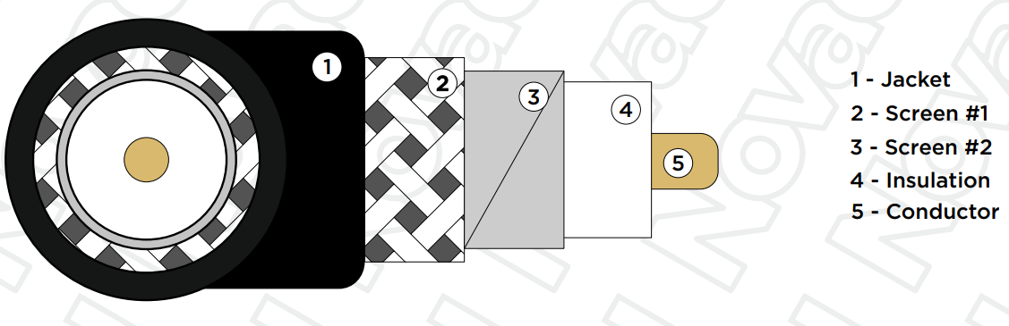 Состоит из одного (1) медного проводника (OFC, бескислородная медь) диаметром 0,8 мм, изоляция выполнена из FPE (вспененный полиэтилен) диаметром 3,7 мм, оболочка из FRNC (пожароустойчивый, не подверженный коррозии материал), общий диаметр 6 мм. Предусмотрен двойной экран: алюминиевая фольга + оплётка из луженой меди. Не распространяет горение, соответствует требованиям пожарной безопасности IEC 60332-1; IEC 60754-2; IEC 61034.