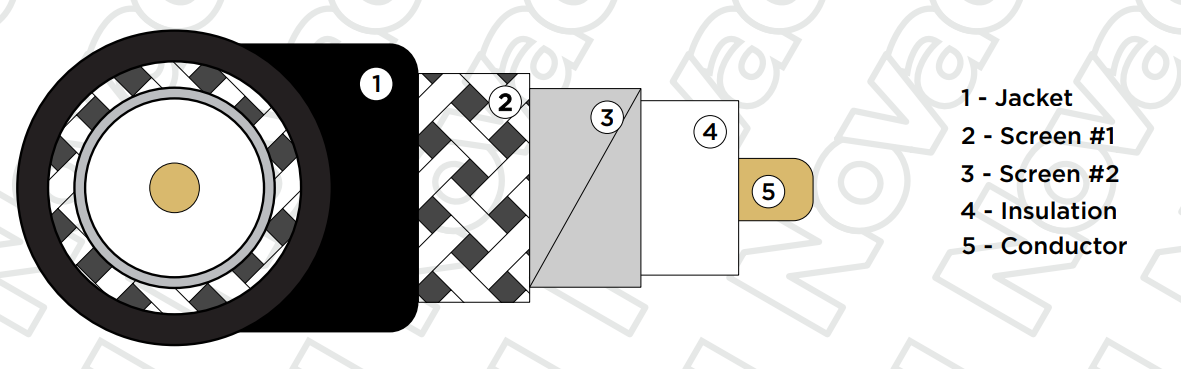 Состоит из одного (1) медного проводника (OFC, бескислородная медь) диаметром 1,02 мм, изоляция выполнена из FPE (вспененный полиэтилен) диаметром 4,57 мм, оболочка из FRNC-C (пожароустойчивый, малодымный, не подверженный коррозии материал), общий диаметр 7 мм. Предусмотрен двойной экран: алюминиевая фольга + оплётка из луженой меди. Не распространяет горение, соответствует требованиям пожарной безопасности IEC 60332-3-24.