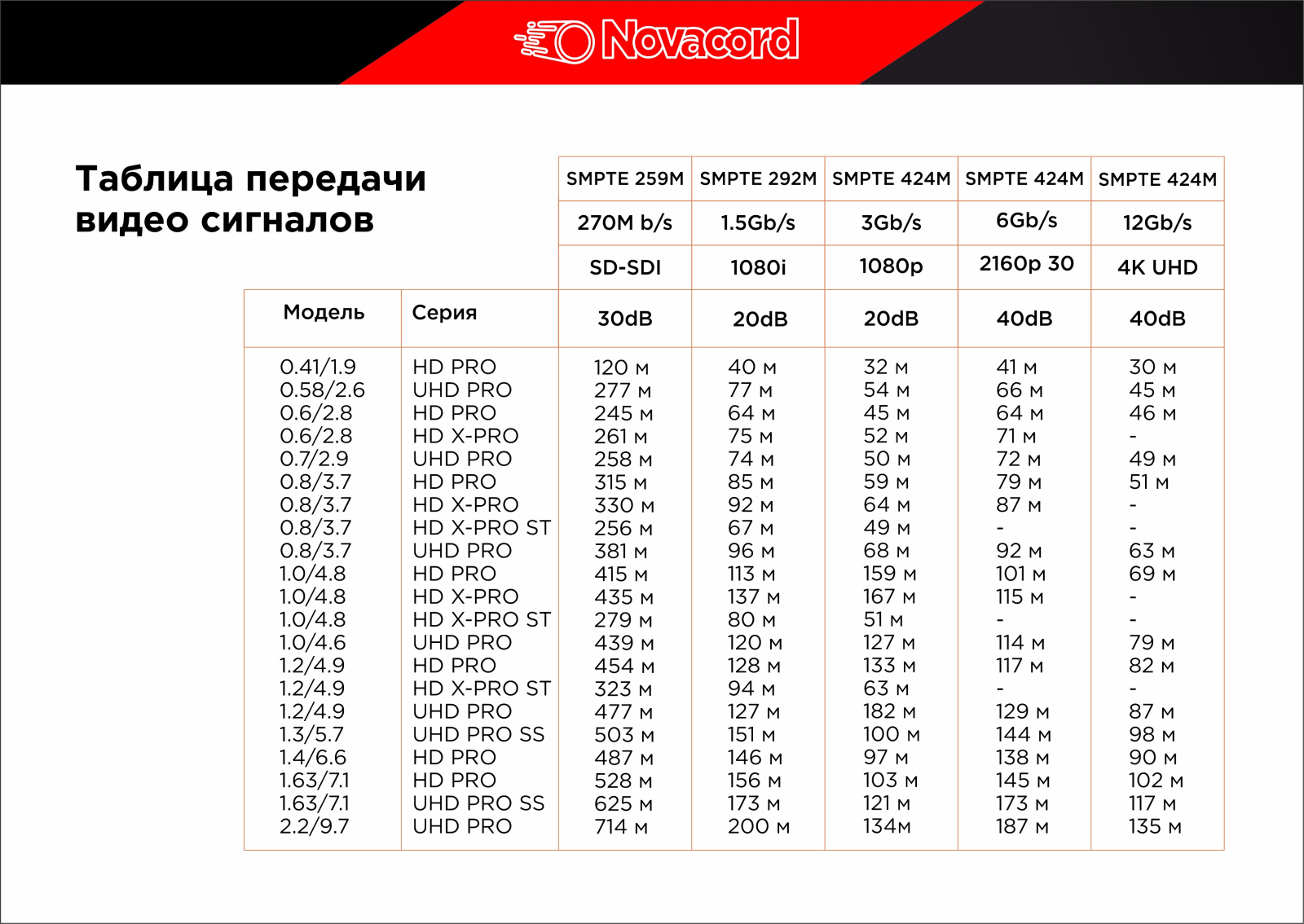 NOVACORD UHD PRO 0.58/2.6 FRNC-C - это огнестойкий коаксиальный кабель, тип mini-RG59. Передаёт цифровые и аналоговые видеосигналы: композитные, компонентные, SDI, SDV, SDTI, HDTV, UHD. Используется с различными разъёмами в телевизионных и других системах требующих трансляции изображения на расстояние. Максимальная дальность передачи данных (длина линии) составляет 277 м. При трансляции сигналов формата UHD расстояние и скорость зависят друг от друга: при 6 Гб/с до 66 м, при 12Гб/с до 45 м. Более подробно смотрите соответствующую таблицу в файлах.