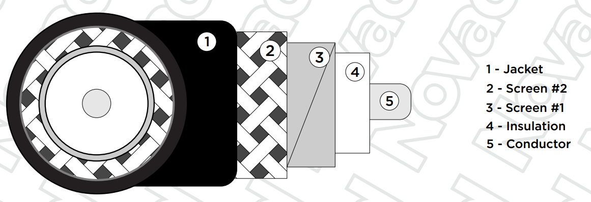 Сопротивление кабеля = 75 Ом. Состоит из одного (1) медного проводника (SC, посеребрённая медь) диаметром 0,7 мм, изоляция выполнена из FHDPE (вспененный полиэтилен высокой плотности) диаметром 2,9 мм, оболочка из FRNC-C (пожароустойчивый, малодымный, не подверженный коррозии материал), общий диаметр 4,5 мм. Предусмотрен двойной экран: алюминиевая фольга + оплётка из луженой меди. Не распространяет горение, соответствует требованиям пожарной безопасности IEC 60332-3-24.