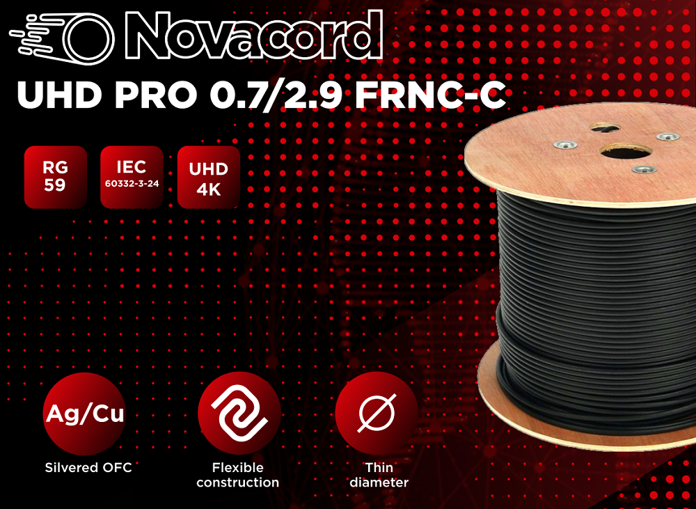 NOVACORD UHD PRO 0.7/2.9 FRNC-C - это огнестойкий коаксиальный кабель, тип RG59. Передаёт цифровые и аналоговые видеосигналы: композитные, компонентные, SDI, SDV, SDTI, HDTV, UHD. Используется с различными разъёмами в телевизионных и других системах требующих трансляции изображения на расстояние. Максимальная дальность передачи данных (длина линии) составляет 258 м. При трансляции сигналов формата UHD расстояние и скорость зависят друг от друга: при 6 Гб/с до 72 м, при 12Гб/с до 49 м. Более подробно смотрите соответствующую таблицу в файлах.