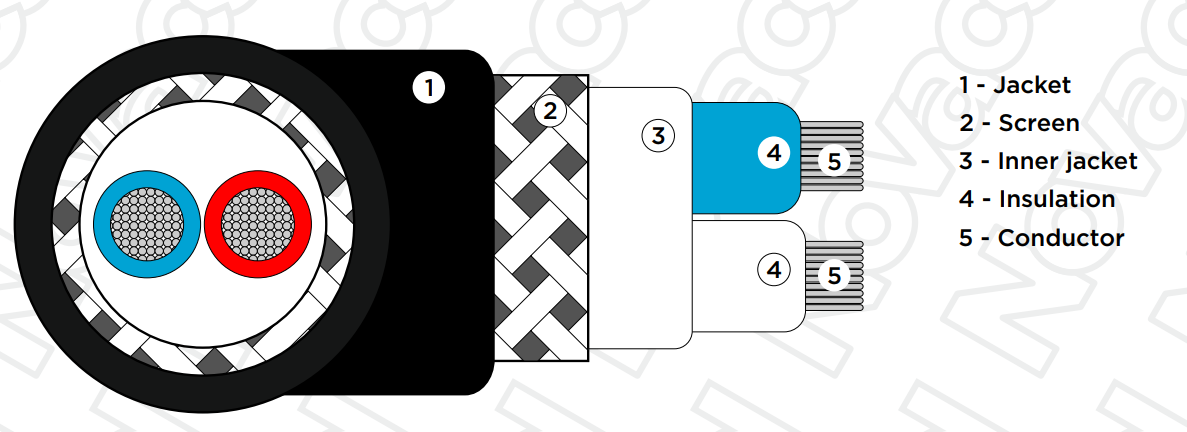 Изоляция проводников выполнена из PE (полиэтилен) белого и синего цвета, каждый проводник покрыт экраном из витой чистой меди (85% покрытие) + их пара покрыта экструдированным PE для повышения прочности. Гибкая оболочка выполнена из FRNC-C (пожароустойчивый, не подверженный коррозии материал) черного цвета. Не распространяет горение, соответствует требования пожарной безопасности IEC 60332-3-24.