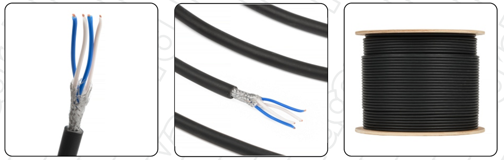 Изоляция проводников выполнена из PE (полиэтилен) белого и синего цвета, каждый проводник покрыт экраном из витой луженой меди (94% покрытие) и бумажной ленты. Для прочности кабеля в структуру внедрены 5 хлопковых нитей. Гибкая оболочка выполнена из PVC (поливинилхлорид) черного цвета. Соответствует требования пожарной безопасности IEC 60332-1.