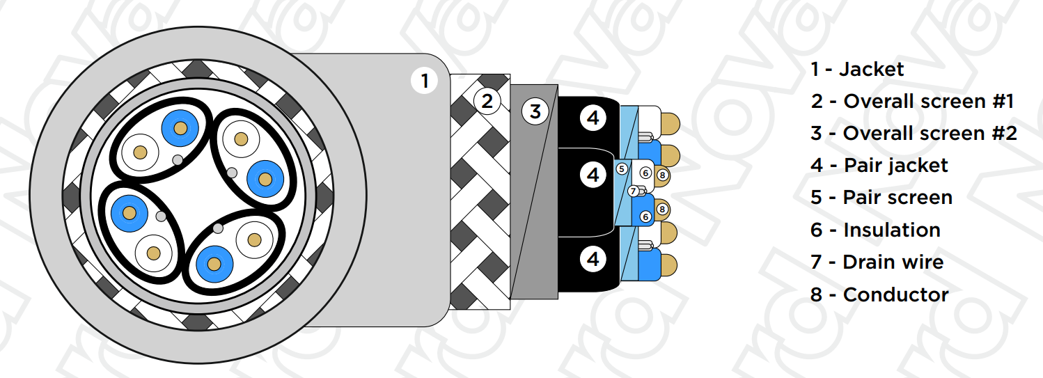 Структура кабеля: четыре (4) двухканальных пары проводников из OFC (бескислородная медь) + дренажная жила у каждой пары; круглое сечение: 4 × 2 × 0.26 мм (AWG 23). Общий диаметр кабеля = 9,5 мм. Сопротивление кабеля 110 Ом, скорость распространения (velocity ratio) = 78%, импеданс 165 Ом/км.
