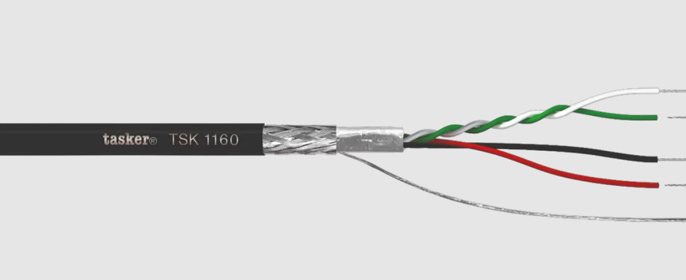 Структура кабеля. Два свитых между собой изолированных проводника (витая пара) + два "свободных" изолированных проводника; сечение 2×0.14 мм² и 2×0.22 мм². Витая пара: многожильные проводники из луженой бескислородной меди OFC (99,99% очистки; 7 жил толщиной по 0,16 мм), каждый из них в изоляции из высокоплотного полиэтилена (белый и зеленый цвет), Ø 1.0 мм. "Свободные" проводники: многожильные проводники из луженой бескислородной меди OFC (99,99% очистки; 7 жил толщиной по 0,2 мм), каждый из них в изоляции из ПВХ (красный и черный цвет), Ø 1.0 мм. Общий двойной экран: алюминиевая/майларовая лента (покрытие 125% площади) + оплетка луженой медью OFC (90% площади) с дренажной жилой из того же материала.